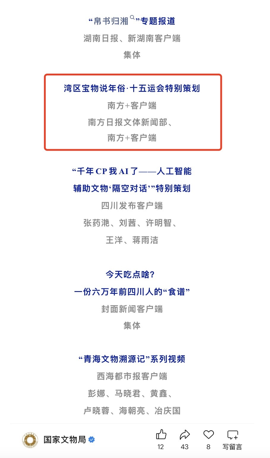 其中,南方报业传媒集团(南方日报社)选送的“湾区宝物说年俗·十五运会特别策划”入选推介作品名单。该作品由南方日报社、南方+联合广东省博物馆、粤港澳大湾区博物馆联盟推出。