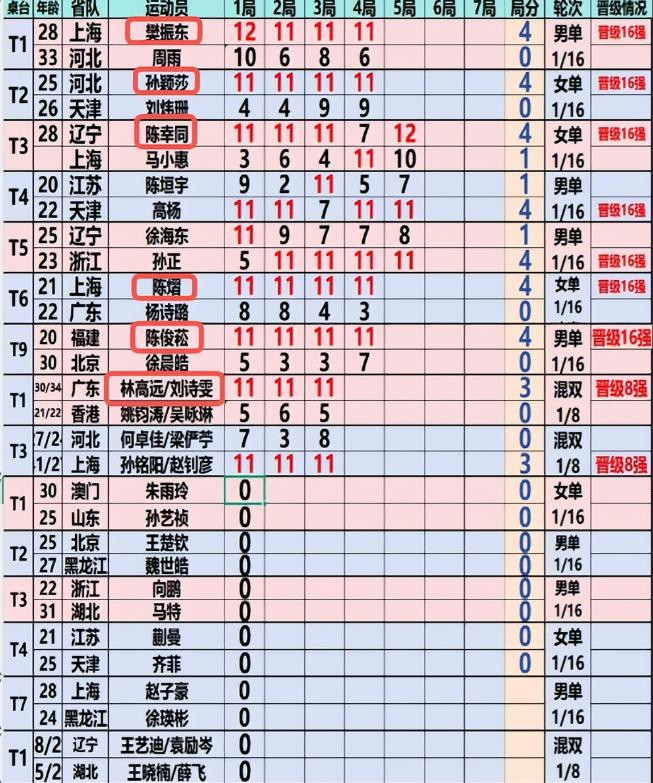 除了爆冷,赛场也不乏惊喜:混双 “王牌组合” 林高远 / 刘诗雯轻松晋级 8 强,默契依旧;黑马陈俊菘更是 4 局横扫北京队三号种子徐晨皓,对手全程只拿到 18 分,展现出超强潜力。